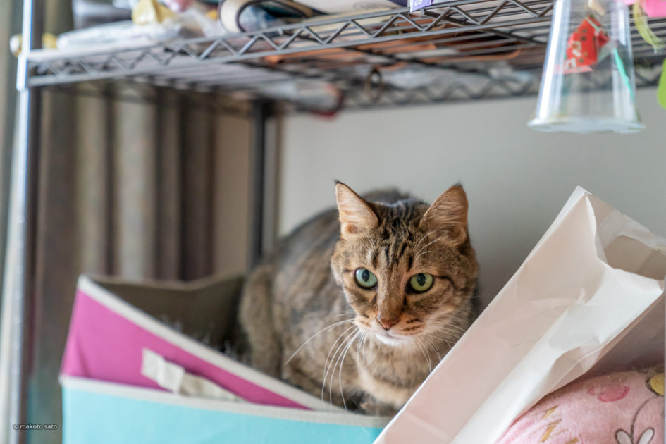 メタルラックに置いてあったケースを、勝手に寝床にしているキンタ。 ムナッ、と出てきました。・・・けど、眠そう。 カテゴリ: キンタ2018年9月14日コメントを残すタグ: キンタSony Alpha a9Sony FE 24-70mm F2.8 GM この投稿をシェアする TweetShare on Twitter Share on FacebookShare on Facebook Pin itShare on Pinterest Share on LinkedInShare on LinkedIn Post navigation前の記事Previous post:ゴロリン次の記事Next post:真っ逆さま関連投稿キンタ永眠しました2023年10月29日満20歳となったキンタ2023年8月20日1年ぶりの猫の日キンタ2023年2月22日スーパー猫の日のキンタ2022年2月22日振り向くキンタ2022年2月19日なんだい?2021年11月30日