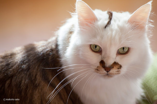 冬の鈍い日射しが、少し逆光気味に差し込む中で、はなちゃんを撮影。毛先が光に反射して、キラキラ輝きます。