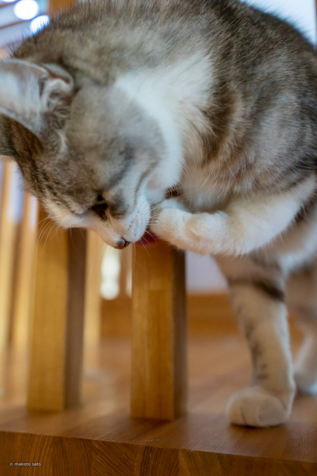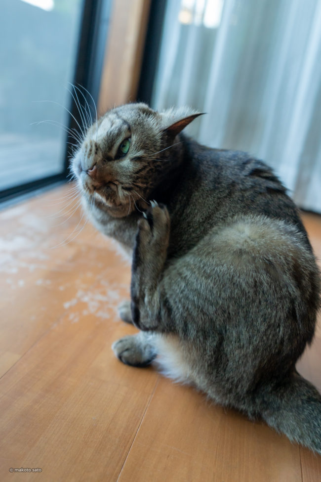 後ろ足で、頭の上をカキカキ・・・やってる事は解るんですが、そのためにはどうしてもこの姿勢に。首の角度がコワイ(^^;