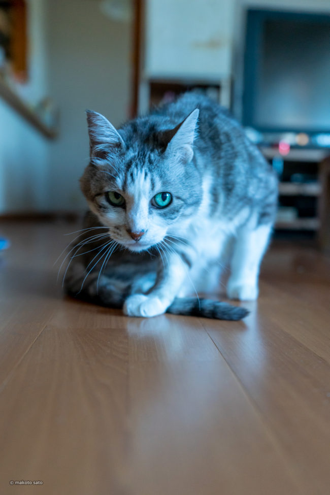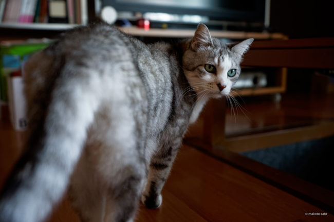 フラリとしていたら、突然尻尾の付け根辺りを毛繕い。で、チラリ。