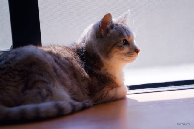 お昼近くのいつもの窓辺。5月の爽やかにそよぐ風を感じるギンタなのでした。