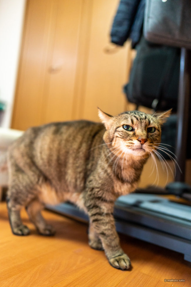 キンタを呼び止めてみたら、立ち止まってニャ、ニャーン。